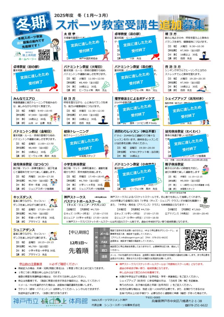 冬(2026年1月スタート)から始まるスポーツ教室の参加者の『追加』募集しております!